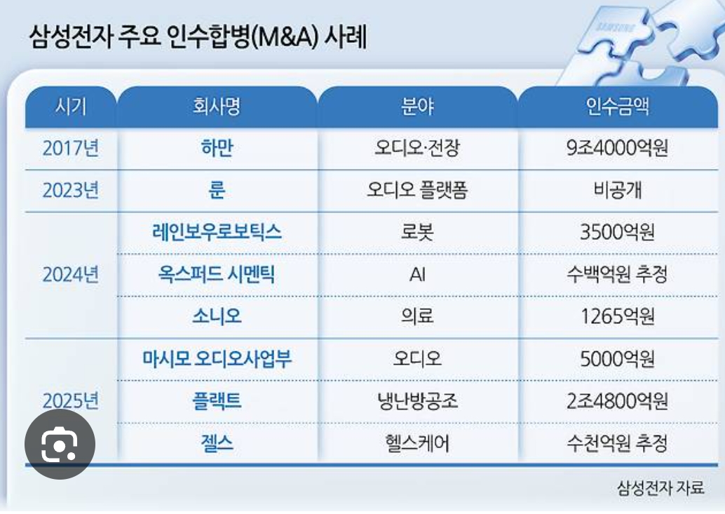 - 특히 전장 반도체·로봇은 삼성의 메모리·파운드리·모바일 사업과 시너지가 크기 때문에, “하만 2.0” 수준의 전장/로봇 플랫폼 기업 인수 가능성이 자주 거론됩니다.
