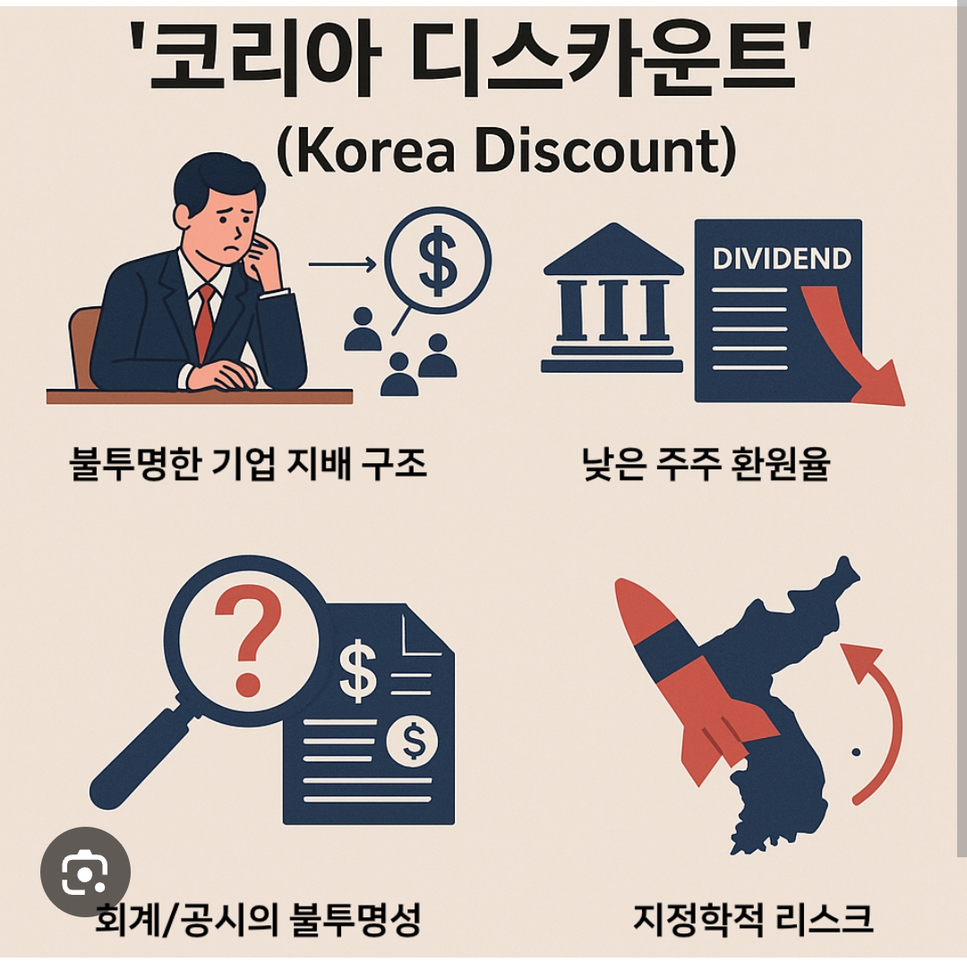 한국 증시가 오랜 기간 저평가되어 왔던 이유는 단순히 경기 때문이 아니었다. 해외 투자자들은 한국 기업의 높은 기술력과 실적에도 불구하고 항상 ‘한국 디스카운트(Korea Discount)’를 적용해왔다.
