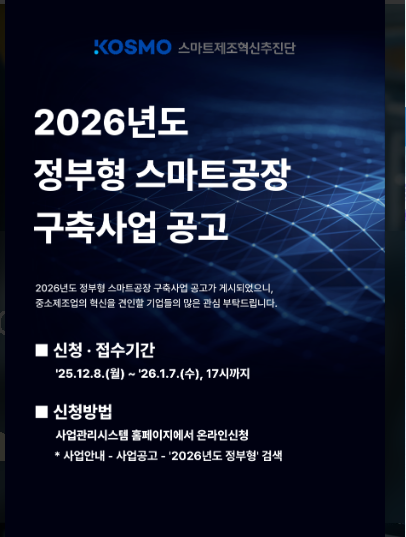 | [2026 스마트공장 정부형 지원사업] 중견기업이 AGV·DX 구축에 활용하는 실전 전략 (0) | 2025.11.29 |
